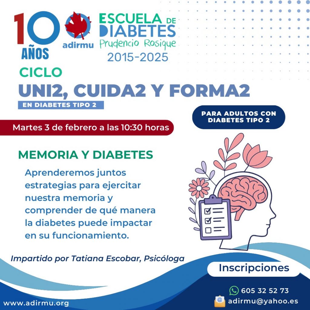 La Escuela de Diabetes Prudencio Rosique de ADIRMU organiza una nueva actividad formativa dirigida a personas adultas con diabetes tipo 2. El próximo martes 3 de febrero, a las 10:30 horas, se celebrará una nueva sesión del ciclo “Uni2, Cuida2 y Forma2 en Diabetes Tipo 2”, centrada en la relación entre memoria y diabetes.