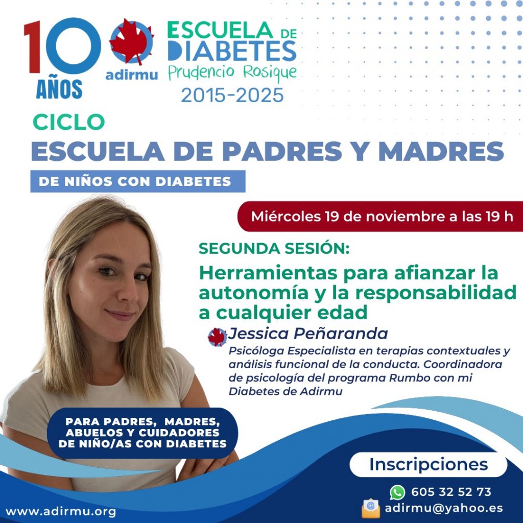 El miércoles 19 de noviembre a las 19:00 h tendrá lugar la segunda sesión del ciclo Escuela de Padres y Madres de Niños con Diabetes, titulada “Herramientas para afianzar la autonomía y la responsabilidad a cualquier edad”. La formación estará a cargo de Jessica Peñaranda, psicóloga especialista en terapias contextuales y análisis funcional de la conducta, y coordinadora de psicología del programa Rumbo con mi Diabetes de Adirmu. Esta sesión está dirigida a padres, madres, abuelos y cuidadores de menores con diabetes y busca ofrecer estrategias prácticas para fomentar su independencia y autocuidado.